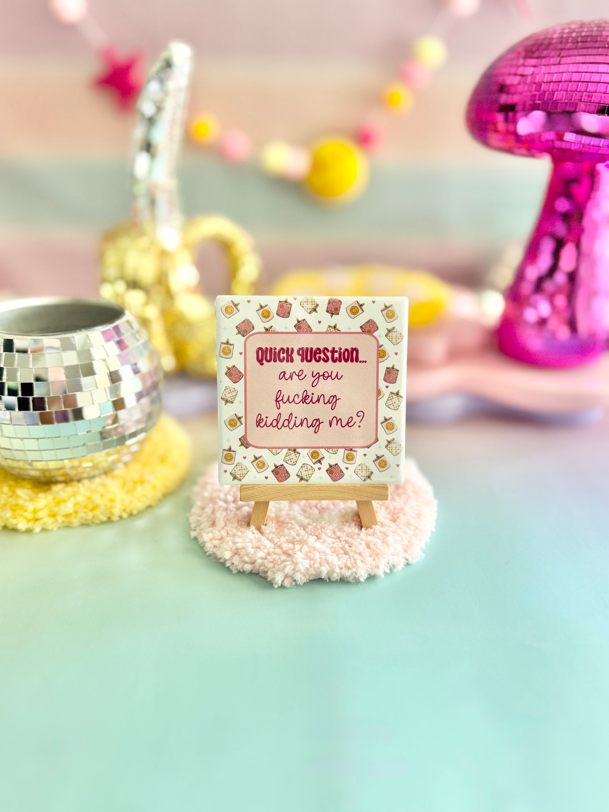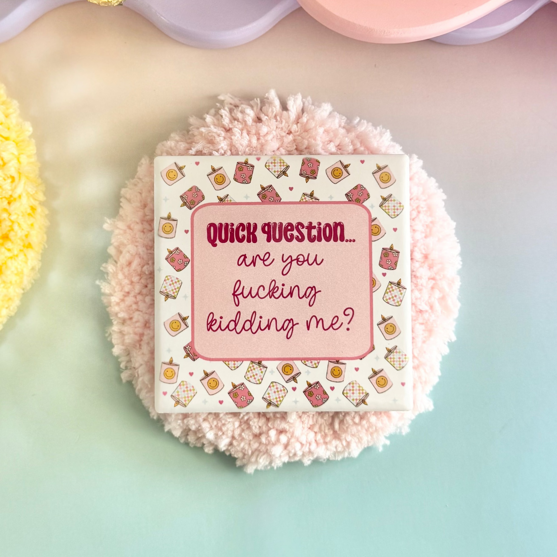 Are you fucking kidding me? Meet the Are You Fucking Kidding Me Ceramic Coaster—the cheeky sidekick every drink deserves and every table secretly needs. This 4" square ceramic coaster brings personality and surface protection to your setup, whether you're sipping coffee, cocktails, or chaos.